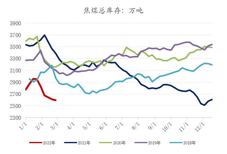 当前焦煤供需关系紧张最为直接的反映,就是焦煤的库存处于持续快速下降的状态。从mysteel调研的数据来看,截至上周焦煤总库存(独立焦企+钢厂+港口) 为2597万吨,较春节前峰值水平下降近360万吨,较去年同期下降近790万吨。焦煤供需紧张的矛盾何时缓解,最直接的反映就是焦煤的库存何时能回升。