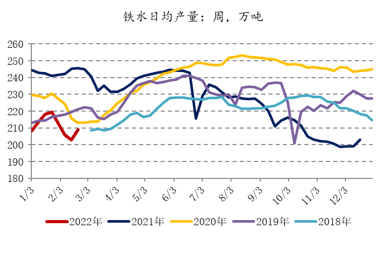 随着冬奥会以及秋冬季限产的结束,北方地区钢厂以及焦化厂陆续进入复产阶段。从mysteel调研的数据来看,上周铁水产量环比增长5.85万吨,至208.9万吨的水平。同比下降36.2万吨,降幅14.8%。