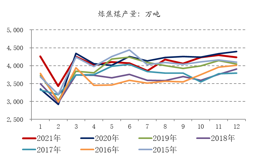 近几年在环保政策以及安全生产等因素的共同作用之下,国内煤炭的产能增长出现了较大的瓶颈。以炼焦煤为例,2021年焦煤产量4.9亿吨,同比增长482万吨,增幅1.9%。