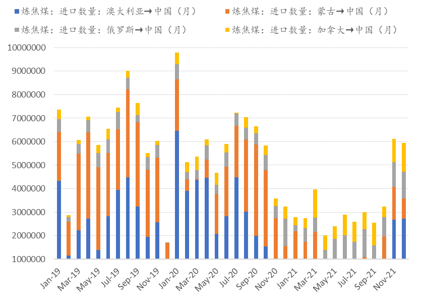 根据海关数据统计,2021年我国进口焦煤累计5470万吨,同比下降1786万吨,降幅达到24.5%。这其中,从蒙古进口了1400万吨,同比下降970万吨。从澳洲进口617万吨,同比下降2919万吨。从俄罗斯进口了1073万吨,同比增长400万吨。