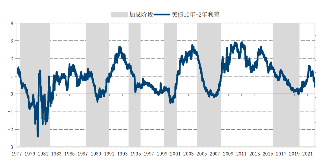 美债长短端期限利差一方面反映市场对货币政策的紧缩预期,一方面反映市场对未来经济增长的预期,当利差降至0以下往往意味着加息将告一段落,这在过去20年中尤为明显。自去年11月美联储显著转鹰对通胀暂时性重估后,市场美联储加息预期持续加强,美债期限结构显著走平,在1月通胀数据公布后加速走平。本次美国疫情后,在财政支持下居民消费强势,经济快速复苏,随着财政影响褪去是否会带来快速进入衰退,进而限制加息的空间,仍有待观察。但2月下旬,10年-2年期利差已降至0.4-0.5%附近,与此前的八轮加息周期起点相比,是除1999年和1980年加息外的最低水平。当美债期限结构出现倒挂时,往往意味着市场担忧经济面临衰退风险。2019年8月,美债10年-2年期利差转负倒挂后,美联储于9月、10月进一步降息。因此当前处于低位的期限利差可能意味着未来美联储加息空间受限,本轮加息阶段的时长可能不会太长。