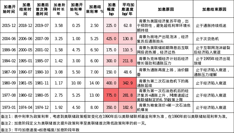 首先,我们复盘过去50年美联储加息阶段的历史背景,发现大部分美联储加息的背景通胀上行和经济的持续复苏,加息结束的原因往往在于经济出现衰退或陷入危机。过去最快的加息发生在1980年9月-1981年11月,和1977-1980年5月,这两个时期加息背景均为石油危机下的高通胀问题。而本次加息的背景也较为相似,以原油和天然气为代表的各类能源价格出现大幅上升。与过往加息背景最为不同的是2015年12月-2019年7月的最近一次美联储加息,它更多出于预防性目的,并没有出现较高的通胀水平。